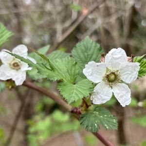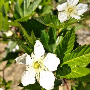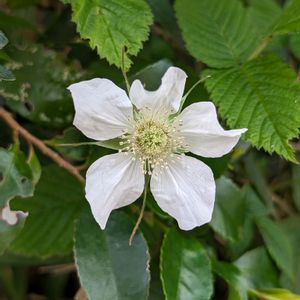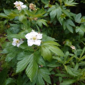梶苺 (カジイチゴ) バラ科 お花は4~5月に 冬芽からのびた枝の先に 集散花序が出て白い花を上向きに3~5個付けます。 花期が長いため モミジイチゴなどとの交雑種が多い。 白さが際立って 目を引きますね。