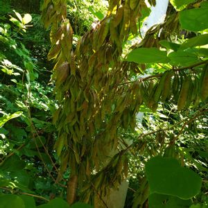 これって何の木でしょう?豆みたいな物が大量にぶら下がってるけど、豆科の木かな?