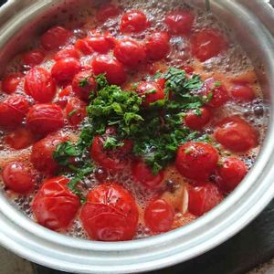 ⏳9:20 🍅ソース第二だん🎵 黒胡椒、バジル、ニンニクパセリとお塩をいれて煮詰めます。 今日はかなり多量にソースができそうです🥰