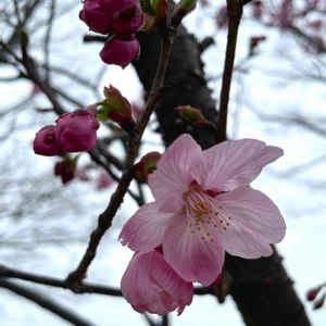 家の桜がちらほら咲き始めました。 陽光桜🌸でピンク色の綺麗な花が たくさん咲きます💗 今年はゆっくりでいいから 長く咲いていて欲しいです。