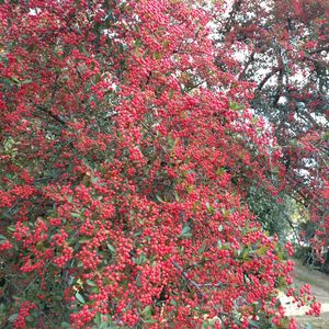 ピラカンサ バラ科トキワサンザシ属の常緑低木。ピラカンサはトキワサンザシの仲間の総称で、日本では主にトキワサンザシ、ヒマラヤトキワサンザシ(別名 カザンデマリ)、タチバナモドキの3種類がピラカンサと呼ばれている。雑種も多く、識別するのが難しいケースもある。いずれも一年中細い枝に艶やかな濃緑色の小さな葉をつける。花期は5〜6月。木に雪が降り積もったように白い花が枝を埋める。秋から冬にかけて枝がたわむほど果実が実る。果実は偏球形の偽果(ナシ状果)。美味しそうに見えるが毒があり、まとめて食べれば鳥も毒にあたる。3種類とも耐寒性、耐暑性に優れ剪定にも耐える。 名前は属名の音読み。属名はpyro(炎)+acantha(刺)の合成語。果実の熟した鮮やかな果色を炎にたとえ、枝に刺があることを表す。 3種類の違いは次の通り。 常磐山査子(トキワサンザシ) ・西アジア原産で明治時代中期に渡来した ・赤い果実は扁平で小さめ ・葉は靴べら形 ヒマラヤ常磐山査子(別名 花山手鞠カザンデマリ) ・ヒマラヤ原産 ・赤い果実は3種類の中で最も大きい ・葉は細長い 橘擬(タチバナモドキ) ・中国原産 ・果実は黄橙色 ・果実の色と形がミカン科のタチバナに似るのが名の由来 出典『樹木の事典600種』『葉っぱで見わけ五感で楽しむ樹木図鑑』『樹木 見分けのポイント図鑑』『草木の種子と果実』