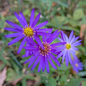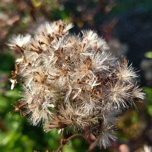野紺菊(ノコンギク) キク科シオン属の多年草。日本の野菊を代表するのが本種で山野の至るところに普通に見られる。高さ0.5〜1m。地下茎を伸ばして殖える。茎はよく枝分かれし、短毛が密生する。葉も両面に短毛が生え、ざらつく。根生葉は卵状長楕円形。花茎の根生葉は花の頃は枯れる。花期は8~11月。頭花は直径約2.5㎝。中心に黄色の筒状花が多数あり、周りに淡青紫色の舌状花が1列に並ぶ。総苞は半球形で長さ4.5〜5㎜。総苞片は先端は紫色を帯び、3裂に並ぶ。果実は痩果。長さ1.5〜3㎜の扁平な倒卵状長楕円形。冠毛はヨメナより長く、長さ4〜6㎜。地下茎を伸ばして殖えるが、風で種子も飛ばす。 よく似た紺菊(コンギク)は自生品種の中から選ばれた栽培品種で古くから観賞用に栽培されている。花色が白いものはシロバナコンギクといい稀に見つかる。嫁菜(ヨメナ)にも似るが、ヨメナの葉はつるつるしていて、冠毛は短い。 観賞用の栽培品種に花が濃青紫色の紺菊(コンギク)があり、それに対して野に生える紺菊の意味で野紺菊の名が付いた。菊の語源については諸説ある。一説として、中国の『本草綱目』(1578年)によると、『菊は蘜と書き、鞠と同じ。鞠は窮の意。九月に咲く。九は陽の数の最後。窮極の華だから菊』という。 出典『野に咲く花』『秋の野草』『帰化&外来植物見分け方マニュアル 950種』『草木の種子と果実』『野草の名前 秋冬』