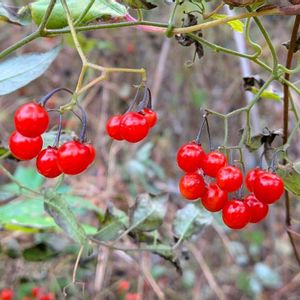 鵯上戸(ヒヨドリジョウゴ) ナス科ナス属のつる性多年草。山野に生える。全体に軟毛を密生し、葉柄で他物に絡みついて伸びる。葉は互生し、長さ3〜10㎝の卵形。下部の葉は深い切れ込みがある。花期は8~9月。花は白色で直径1㎝ほど、集散花序に多数つく。花冠は5裂して反り返り、赤い葯が目立つ。果実は液果。球形で径8㎜ほど。赤く熟す。種子はほぼ円形で平たい。微細な凸凹があり縁は狭い翼状。 全草を乾燥させたものを利尿、解熱、解毒などの薬として用いる。現在の中国では本種の全草を乾燥させたものを『白毛藤』の生薬名で、解毒、解熱、利尿促進などに内服したり、解毒などには煎じた汁で洗ったり、葉汁を外用したりしている。 晩秋に赤く熟す液果をヒヨドリが喜んで食べるのが名前の由来。 出典『山に咲く花』『草木の種子と果実』『里山の植物 ハンドブック』『薬草の呟き』