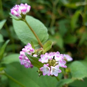 溝蕎麦(ミゾソバ) タデ科イヌタデ属の一年草。田のあぜや水辺などやや湿ったところに群生する。茎には下向きの刺があり、下部は地を這う。葉は互生し卵状鉾形で、先は鋭く尖り、基部は耳状にはりだす。両面とも星状毛と刺がある。托葉鞘は短い筒形で、ときに上部が葉状に広がる。花期は7~10月。花は枝先に10数個集まってつく。花被は5裂し、裂片の上部は紅紫色、下部は白色。花色には濃淡があり、純白花をつける品種をシロバナミゾソバという。痩果は3稜のある卵球形で、花被に包まれる。地中にも小さな閉鎖花をつけ、これも結実する。 溝に多く生え、葉の形が蕎麦に似ていることが名前の由来。葉が牛の顔を正面から見た形に似ているのでウシノヒタイの別名もある。 出典『野に咲く花』『散歩の草花図鑑』