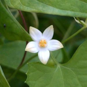 雀瓜(スズメウリ) ウリ科スズメウリ属のつる性一年草。原野や水辺などに生える。葉は長さ3〜6㎝、幅4〜8㎝の三角状卵心形で、しばしば浅く3裂する。葉と向かいあって巻きひげがつき、この巻きひげで他の草などに絡みつく。花期は8~9月。雌雄同株。雄花、雌花ともに葉腋に単生するが、枝先ではときに雄花が総状につくこともある。花のすぐ下に丸い緑色の玉があるのが雌花。雄花は雄しべだけ、雌花は雌しべだけしかない。果実は液果。球形または卵形。細い果柄にぶら下がり、灰白色に熟す。種子は楕円形で平たく、両面に楕円形の浅いくぼみがある。果実に種子は16〜20個。秋になるとつるが垂れ下がり、地中にもぐって肥大した塊根をつくって越冬する。この特性はカラスウリやアマチャヅルにも見られる。 果実がカラスウリに比べて小さいことが名前の由来。果実をスズメの卵に見立てたという説もある。昔の人は、植物の名前をつける時、よく知っている動物の名前を借りてつけた。特に、大きさの大小を表すことが大切な時は、名前だけで大きさが想像できる動物を選んだ。それが、スズメウリに対するカラスウリである。スズメとカラスは果実や草姿の大きさを示す名前であった。 出典『野に咲く花』『夏の野草』『四季の野の花図鑑』『草木の種子と果実』『野草の名前 秋冬』