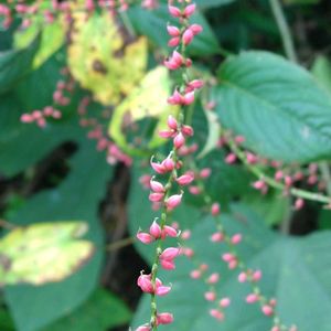 水引(ミズヒキ) タデ科イヌタデ属の多年草。林ややぶのふちなどに生える。高さ50〜80㎝。葉は互生し、長さ7〜15㎝の広楕円形〜倒卵形で先は急に尖り、中央付近にしばしば黒い八の字形の斑点がある。花期は8~10月。茎の先に長さ約30㎝の細い総状花序をだし、小さな花がまばらに横向きにつく。花被片は深く4裂し、上側の3個は赤く、下側の1個は白い。花被片が全部白色のものもあり、ギンミズヒキと呼ばれることもある。花柱は2個。果実は痩果。花被片に包まれて熟し、先がカギ状に曲がった花柱が残り、これで動物などにくっついて運ばれ、種子散布される。そっくりな別種にシンミズヒキがあり、花がやや密につき、葉に黒斑がない。 花穂を上から見ると紅く見え、下から見上げると白色に見え、このような特徴をとらえて、祝儀袋の『水引』の名前を借用したのが名前の由来。 出典『野に咲く花』『四季の野の花図鑑』『野草の名前 秋冬』