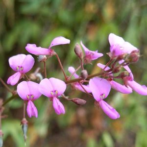 荒地盗人萩(アレチヌスビトハギ) マメ科ヌスビトハギ属の多年草。1940(昭和15)年に大阪府で初報告された北アメリカ原産の帰化植物。荒れ地や道端に生える。茎は高さ1mほどで、開出毛が多い。葉は3小葉からなり、小葉は長さ5〜8㎝、幅2〜4㎝で両面に伏毛が密生する。花期は7~10月。花は帯青紫色で、長さ7〜8㎜とヌスビトハギよりやや大きい。夕方にはしぼんで赤くなる。果実は5〜6個の小節果からなり、小節果は長さ約7㎜。 ヌスビトハギ属の帰化植物には、他にアメリカヌスビトハギとイリノイヌスビトハギがあるが、いずれも果実の節が日本産ほどくびれないのが特徴。 ヌスビトハギの仲間の果実は、2つ以上のくびれがあるので節果(せつか)という。この節果にはかぎ形の毛が密生しているため、そばを通ると動物や服のあちこちにその節果がつく。知らぬうちに節果がくっつくことが、昔の盗人が目星をつけた人に取りつくことに似ているので、『盗人』の名前をつけた。そして、花が萩に似るので『萩』を加えた。盗人の名前の由来については、もう1つの説がある。節果をよく見ると盗人の足跡に似ている。金品を包んだ大風呂敷を背負い、抜き足差し足忍び足で歩く。盗人は足袋を履いている。つま先で歩くので、この節果とそっくりの足跡になる。 出典『野に咲く花』『帰化&外来植物見分け方マニュアル 950種』『日本帰化植物写真図鑑』『野草の名前 秋冬』