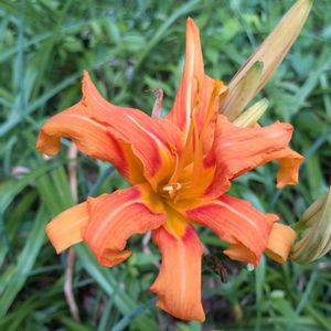 薮萱草(ヤブカンゾウ) ススキノキ科ワスレグサ属の多年草。有史以前に中国から渡来し、食用、薬用として栽培されていたものが野生化したといわれる。道端や土手、林縁などに生える。根は所々紡錘状にふくらむ。葉は広線形。花期は7~8月。花茎は1mほどになり橙赤色の花を数個つける。雄しべの何本かが花弁化して八重咲きになるのが特徴。個体によって花弁化の状態は様々。 同じく古い時代に中国から渡来したヒガンバナやシャガなどと同じで結実しない。地下の根の分根によって殖える。また、朝開いて夕方にしぼむ一日花で、翌日には別の花が咲く。 同じような所に生える一重の花はノカンゾウ。葉の幅などでも区別される。 名前は、薮に生えるホンカンゾウ(中国、ネパール、タイに分布するユリ科の多年草。漢名は萱草)という意味。中国ではカンゾウを見て憂いを忘れるという故事があり、『忘れる』に萱の字を当てることから萱草と称する。日本でも身につけると恋しさを忘れさせてくれる草であり、紀貫之の歌にも登場する。 出典『野草・雑草の事典530種』『夏の野草』『都会の草花図鑑』