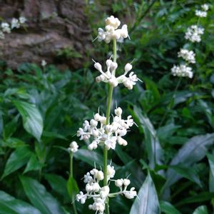 藪茗荷(ヤブミョウガ) ツユクサ科ヤブミョウガ属の多年草。林内など湿り気の多い日陰に生える。茎や葉はざらつく。花期は8~9月。茎の先に白い花が輪生状に数段つき、両性花と雄花がまじってつく。花は開くとその日のうちにしぼむ一日花。果実は球形の液果。秋に藍紫色に熟す。表面に光沢があり、乾いても裂けないため長い間残る。種子は灰色で砂粒ほどの大きさ。 葉がミョウガに似ていて、薮に生えることが名前の由来。ミョウガの仲間ではないので食べられない。葉を揉んでもミョウガの葉のような香りはない。 出典『野草・雑草の事典530種』『野に咲く花』