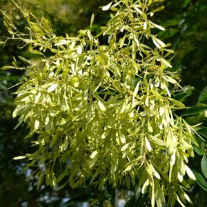 島梣(シマトネリコ) モクセイ科トリネコ属の常緑または半常緑高木。沖縄、中国~インド原産。亜熱帯から熱帯の樹木で、今までの関東では気候に合わなかったが、近年の気温の上昇によって街路樹でも冬を越せるようになった。街路樹や公園樹だけでなく、新しく建った家の庭やマンションの敷地によく植えられている。葉は光沢のある奇数羽状複葉で、小葉が5~9枚つく。関東では半常緑で、黄葉して落ちる葉も多い。花期は5~7月。雌雄異株。枝先や葉腋に大きな円錐花序を出し、白色で芳香のある小さな花を多数咲かせる。果実は翼果。へら形で、樹冠が白くなるほど多数つき、遠くから見ると花が咲いているように見える。秋に褐色に熟して落ちると、くるくると回転して風に乗る。 和名のシマは自生地の沖縄を意味する。トネリコの語源は主に2説ある。1つは、樹皮を煮て膠(にかわ💬動物の骨・皮・腸などを煮て固めたもの。接着剤に使われる)状にしたものを墨に混ぜて練ったものを写経に使用したことから『共練濃(ともねりこ)』からトネリコに転じたというもの。もう1つは、トネリコの樹皮につくイボタロウカタカイガラムシ(通称イボタロウムシ)が分泌する蠟物質から作られる蠟を、戸の滑りを良くするために使用したことから、『戸に塗る木』がトネリコに転じたというもの。 出典『葉っぱで見わけ五感で楽しむ樹木図鑑』『樹木の名前』
