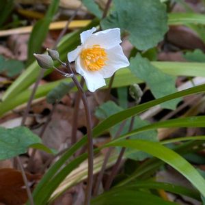 池畔近く~地下水が地表に染み出た林縁の一角にシラユキゲシが咲いています‥①② シラユキゲシ(ケシ科) シラユキゲシ属 中国原産で山野草として栽培されていたものが逸出~野生化したのだとか‥🤔 庭に植えると憎らしいほど増えると言われるシャガと~競い合っているかのよう…一緒に生えています‥💚🤍💚 蕾は薄い皮のような萼に包まれていて、花が開くとともに、萼は脱落するようです‥👀!! 花弁はふつう4枚ですが、枚数には多少の変動があるようです‥🟡🤍💚 ③ 枯れたアカマツの幹をつつくコゲラ~控えめなドラミングの音が聞こえて来ました‥🐦⬛ 巣穴を掘っているのでしょうか‥👀🎶