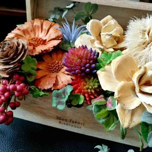 こんにちは☀️ 今日は、お花部に遊びに来ています🎵 さすが、はる師匠✨私の謎の花材も素敵に修正して頂きました💕森の中のような素敵なアレンジ🍀木工作家さんに喜んで頂けますように😆