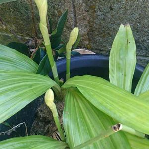 特定できました→カクチョウラン thanks to ヒロ和さん、スミレさん、そして、ピーモモさん。 カクチョウラン(鶴頂蘭)(ファイウス) ラン科、ファイウス属(ガンゼキラン属) 原産地: 日本、中国、東南アジア、オーストラリアなど。 ✴️こちらは、まだ成長過程→1㍍程に達する。1㍍に達した段階で、この蘭の特徴と個性が、顕著になると思います。 ⏺️種子島、屋久島以南に分布➰日本最大の蘭。 ⏺️地生種。✴️養生種のデンファレや胡蝶蘭などは、樹木の幹や樹皮に根を張って育つランでしたね。こちらは、地面に根を張ります。 ⏺️耐寒: 7℃ 🌕花言葉は不明。 (fromNet🔍👓)