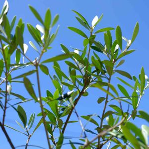 オリーブ。 うちの子はまだまだ小さいのですが 下から撮ってみるとなんかおおきく見える(* ´ ᵕ ` ) 青空に映える緑の葉っぱ。 暑い中でも元気です。 もっと大きくなってね!