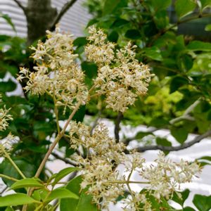 ★シマトネリコ(島十練子、島梣)★ モクセイ科の常緑高木、半常緑高木 花期:4~7月 成長すると高さ10mになる。雌雄異株。雄株は花を付けない。葉は奇数羽根状復葉、小葉が5~13枚、対生につく。花色は白色、香りのある2~3㎜、今年出た枝の枝先に円錐状に密に咲く。果実は翼果、長さ3cm程のへら形、多数つく。 2025.7.2〜4 通勤路にて📷️📱