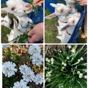 ⭐️こんばんは⭐️ 今日は可愛いヤギ🐐🐐🐐会ってきました❤️まだ生後2ヶ月の兄妹でした😊 クローバー🍀は喜んで食べましたが、ミント🌱は見向きもしませんでした😊味ちゃんとわかるんですね😆 ふわっふわっの毛、触っても怒りもせず可愛いのなんの💕💕💕 ヤギの白つながりで、我が家の白いイベリス🤍とスノーフレークです🤍