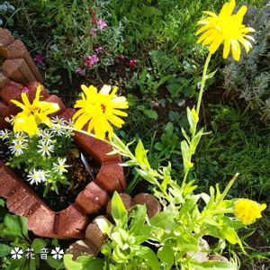 出勤前に1枚パチリ(ˊ˘ˋ*) キンセンカさん達が朝日を浴びてお目覚めです💛 花びらの開きかけが寝癖みたい(*´艸`)𐤔𐤔 そばで野紺菊ちゃんが優しく見守ってますねぇ🌼