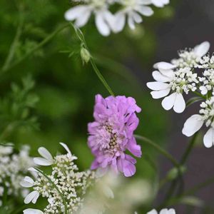 零れ種で咲いた2年目のオルレアの中に、スカビオサがそっと咲いていました♡ ふんわり優しい雰囲気の花たちにこころが和みます♫