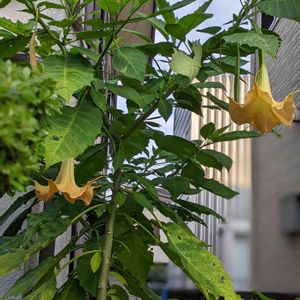 おはようございます☁️ 成長がめざましい 「エンジェルトランペット」 黄色が咲く予定です♪ 1M位になりました🤗 摘芯した方が良いのか? 思案中の楽しみなお花🌼🌼🌼 今日も一日頑張りましょう😉🍀