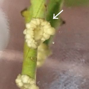 この←矢印の辺り何か付いてる? 何だろぅσ( ̄^ ̄)? 見間違えかなぁ、、、。 バラの水挿し22日目の(笑み)です。