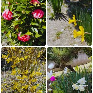 こんにちは😃 風が強くて寒いです。 ツバメが気持ち良さそうに飛んでいました。 ラッパ水仙の黄色と白が元気に咲いています。 椿とレンギョウも咲いています。