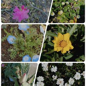 こんにちは😊 左上の花、名前教えて下さい。 ツツジの様な花です。 右上から イチゴの花 ガザニア イベリス チューリップ ネモフィラ イチゴはかってにランナー伸ばして増えました。食べられるといいです🍓🍓😅