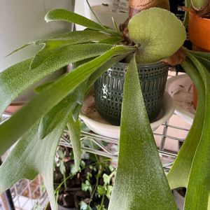 去年苔玉から鉢に植え替えた ビカクシダ☺️貯水葉は 枯れてるのに頑張ってくれている。🥲🙏