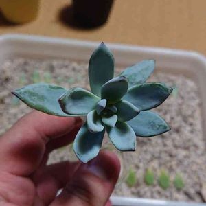 銀武源、葉挿しの方はてんで動きなしなんだが、親株の方がえらいことになってた 子株が3箇所から出てんのよ これまでよくて一人っ子ばっかりだったのが、いきなり増え過ぎではなかろうか これはまた大所帯になるぞ 一方霜の朝の親株はだいぶ干からびそうでやばい感じだったんで、ちょっと日照改善にお引越しさせましたよと