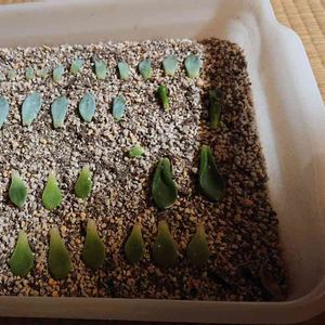 日曜に投稿し忘れたやつを思い出したマン 買ってきた錦晃星を植え替えたついでに、早くなんとかしたらんとって言ってた霜の朝と、同じく葉がつきすぎてひどく前傾してた銀武源をカット 葉挿し用にダイソーで買ってきた大きめのトレーに葉と短くした茎をセットし、カット後の先端はフラスコに立てて乾燥中 週末くらいにはいい塩梅になるかな どっちも葉挿し成功率が著しく悪い、というかゼロだけども、これだけあればいくらか活着してくれんかなぁと