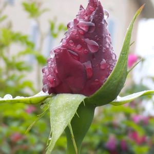 🌱薔薇つぼみ🌱🌹 まだ☔が〜降ってます とてもいい香りで~咲いたら 大輪の薔薇🌹です🙋 雫💧がついて〜何だか キモくないですか?~🙇 🤔😅