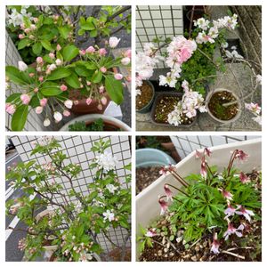 ご近所の行きつけの歯医者さんの植木です 左上と左下:イヌリンゴ(姫リンゴ) ※by ピカピカさん 右下:薄紅肥後スミレ(by navyさん) 右上:源平枝垂れ桃(by navyさん)