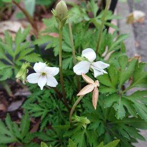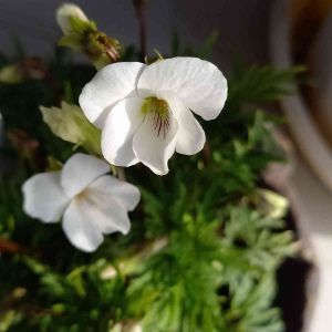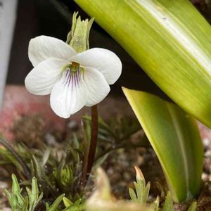 ☁️昨夜からの雨がお昼過ぎにあがり 雲の上から時折り 弱い日差しがさしてきます 今日のお花スミレ 『ヒゴスミレ』です 一輪先終わるとつぎのお花が一輪咲きます 小さなお花は白くて清楚な感じです 前の🌱はこぼれ種が芽生えた ノースポールです