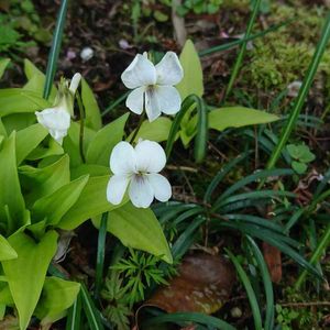 ヒゴスミレがあちらこちらで咲き始めました。白い花きれいです