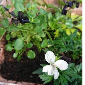 あちこちに咲いたヒゴスミレにブラックビオラをお迎え🖤ビオラは小さく儚げだけど色が強めで負けてない 😆🌿広がるのが楽しみ