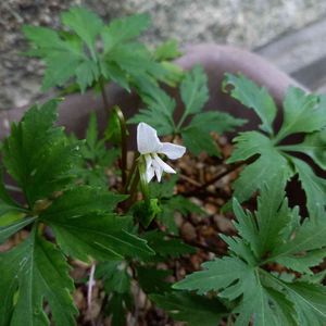 セリバオウレンの鉢に、ヒゴスミレが季節外れの花を咲かせました。😄 春にこぼれた種から発芽したもので、セリバオウレンにしてはちょっと変だなと思ってました。😅