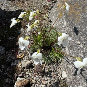 雨の中、近所をお散歩しました。 白いお花が咲いていると思って、近づいて見てみたら、 これは、ヒゴスミレ? 家の近くのアスファルトの道路と塀の境目に咲いていました。 雨が降って、泥がはねて、汚れてしまった(①) 白い花びら。中を見ると、側弁の基部に毛が生えていて、柱頭はカマキリの形です。(②) 横から見てみると。距と萼の感じは、ヒゴスミレの図鑑の写真と似ています。(③) 葉を見て、驚きました。5裂していて、細かく切れ込んでいます。 広げると五角形になります。(④) こんなところに、ヒゴスミレ? 誰かのお庭から、飛び出てきたのかなあ。ご近所さんが育てているのでしょうか。 近くには、スミレも。(⑤)この子は、ノジスミレのようです。 家の近くに咲いているスミレも、いろいろなスミレがいることがわかりました。 お散歩しながら、キョロキョロです。 4.2 教えてくださってありがとうございます。