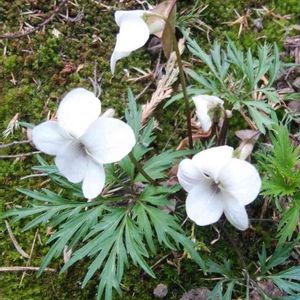 道端 ヒゴスミレ(肥後菫)、スミレ科スミレ属の多年草 🌼花言葉 「手のひらいっぱいの愛情」「あどけない恋」 🌸白色(淡紅色もある)で縁が波うたない、葉は基部近くから5つに分かれ細かく切れ込み糸状
