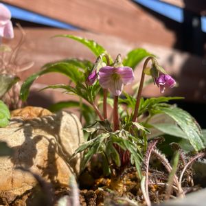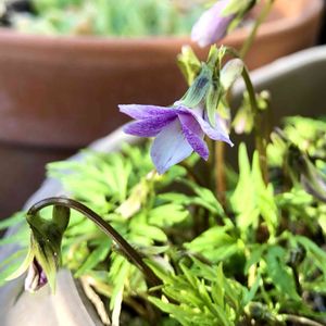 あちこちの鉢に飛び込んでいるスミレで今年初咲きはサワギキョウの鉢でした😊 薄紅色のヒゴスミレが可愛いです😉
