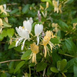 ヒョウタンボク 別名: キンギンボク(金銀木) 液果は、2個がヒョウタン形になるのが名前の由来。 熟すと美しいが、猛毒⚠️なので注意。 ⭕️花が白色と黄色に変わり、白色と黄色の花が同時に見られることから別名キンギンボク(金銀木)とも呼ばれている。 📝 花は6/4投稿
