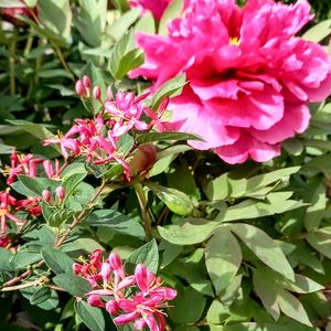 ボタンとアカバナヒョウタンボク 同時にいい感じに咲いてくれました♥️🎶