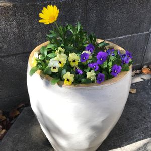 あそこのお宅の玄関先も可愛い寄せ植えがあるんだよなーと、通ってみると、やっぱり咲いていました。クレマチスカートマニージョ。