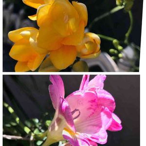 今日はとってもいいお天気で、お花見日和。近所の桜もキレイに咲いているとの事だけど、風邪気味なので外出は自粛します😭 ご近所で可愛いフリージアが2色咲いていました。