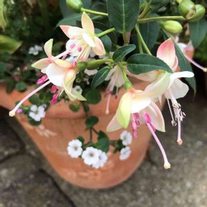 先日投稿した、クレマチスカートマニージョーと同じ鉢に植えられていました。 フクシアだとモンチッチさんに教えていただきました。 フクシアといえば、ピンクだと思っていましたが、これは白がベースでとっても可愛い💕
