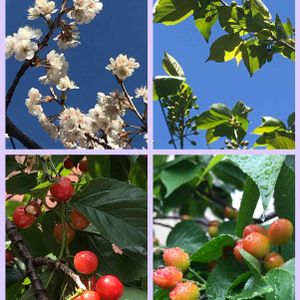 近所のお宅のサクランボを観察してきました。 今日通ったら、いよいよ食べられそうな実になっていました。 左上から時計回りに、3/14→4/11→4/25→5/3