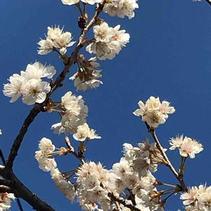 近所のお宅にあるさくらんぼの木。 去年たわわに実っているさくらんぼを見つけたので、今年は花を撮りました。 白い花が青空に映えています。