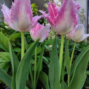 おはようございます🧓 晴れていますが…風が強いです✨☀️🍃 昨年…GSの花友さんのお写真を見せて頂き育てたくなったハウステンボスです🌷 花弁の縁に細かい切れ込みが入ったフリンジ咲き…ピンクと白のグラデーションがとても綺麗で優雅なチューリップです🩷🤍🥰 今日の強い風でユラユラ…折れそうで心配です🤣 不安定なお天気予報です…お気をつけてお過ごしくださいませ✨🍀💕