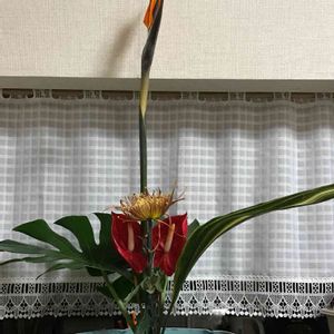 息子作、今週のお稽古花 花器がないので、お稽古通りのかたちはできないと、適当に生けてくれました なんか鳥みたい