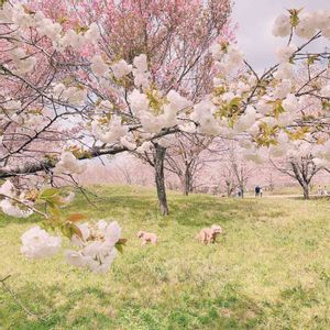 お花見散歩🐾 ソメイヨシノ以外の、いろいろな種類の桜が植えられている公園です😊 手前の白いお花は「白妙」という桜🌸 どれもみんなきれいだなぁ🎶