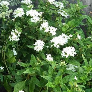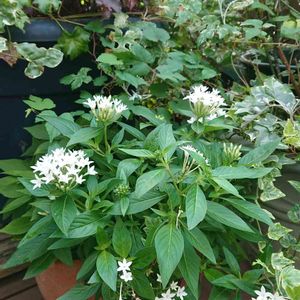 【ペンタス】 真っ白のペンタスが爽やかに咲いています😌 プレミアムサファイアを植えている鉢に植えてしまいました💦 葉っぱ元気そうなので大丈夫かな😆