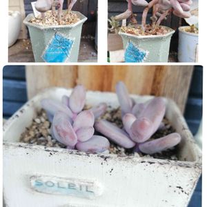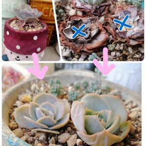 雨ざらしでボロボロになった子 名前もわからなくなってしまいました 分解して葉挿しして、茎?はシオシオになってたのでそのままにしてたら、そこからも新しい子株が! すごーい、だめだと思ってたから感動✨